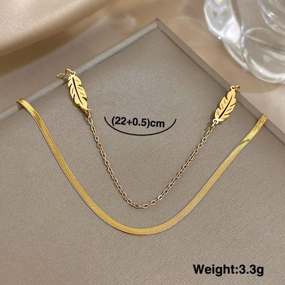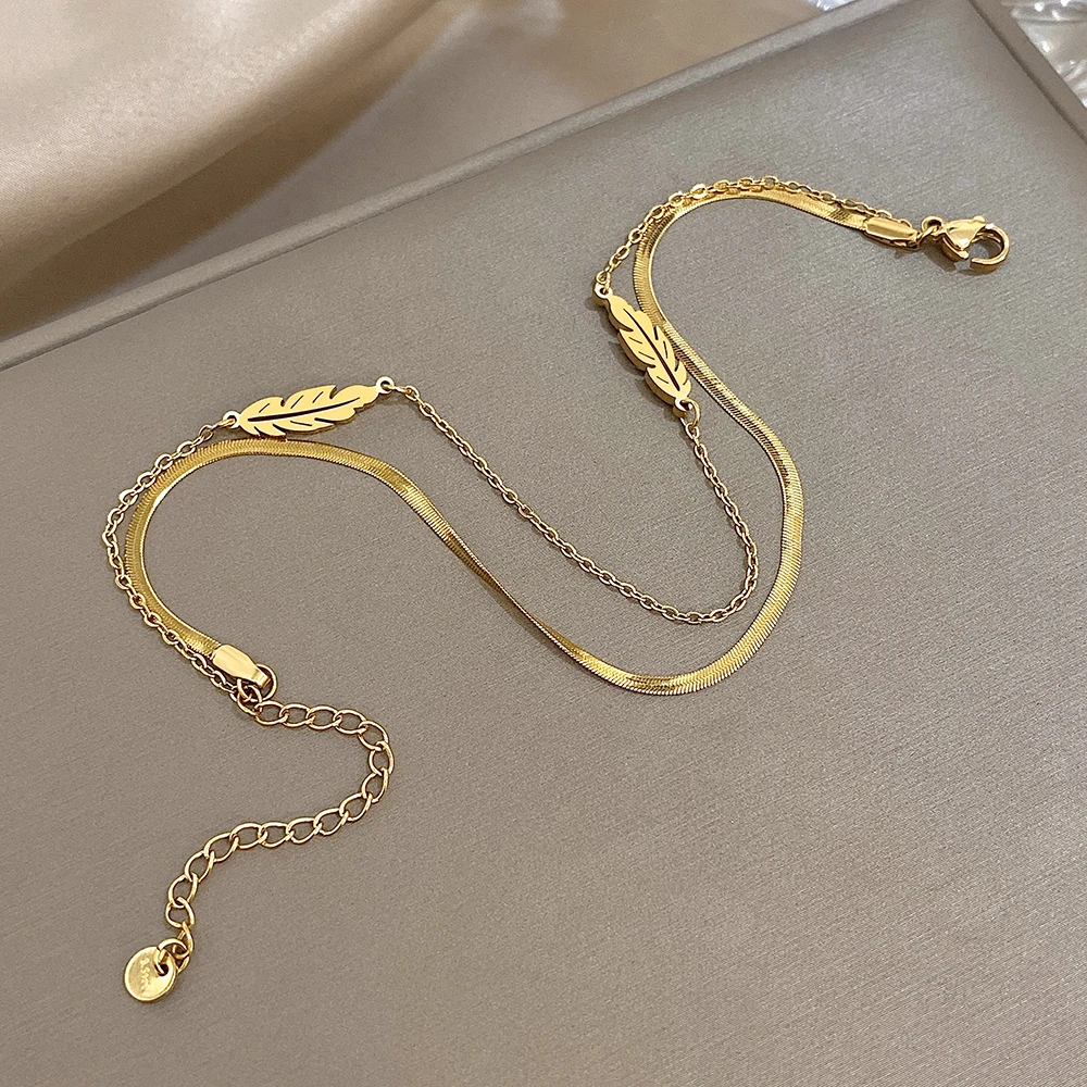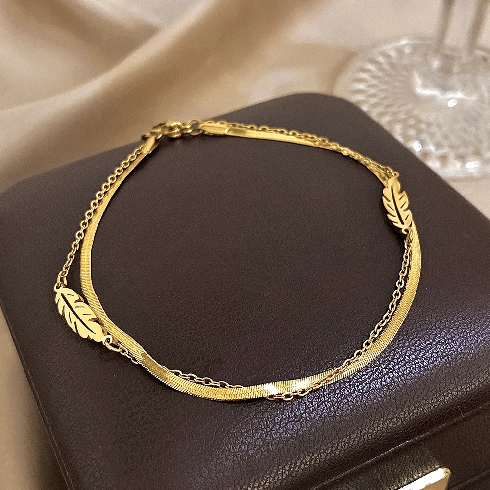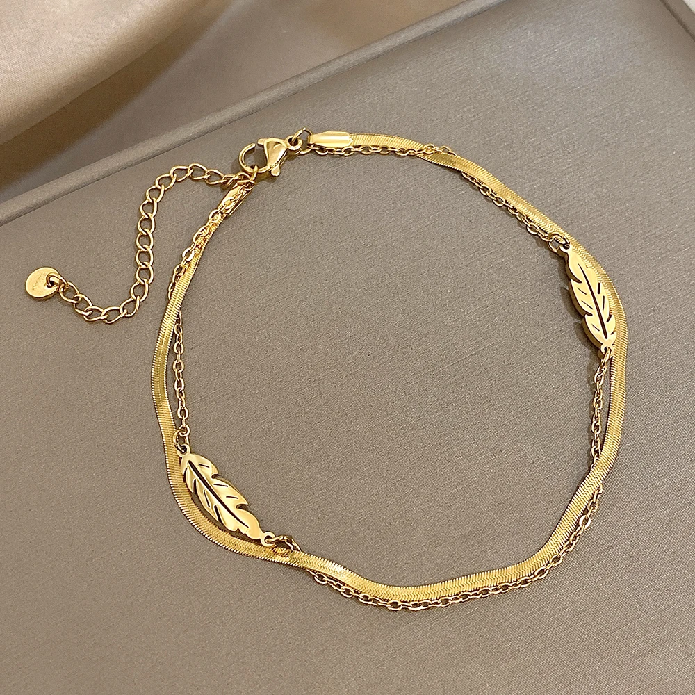 Fashion Stainless Steel Anklets for Women Men Doublelayer Leaves Gold Plated Thick Chain Bracelet Anklet Waterproof Jewelry